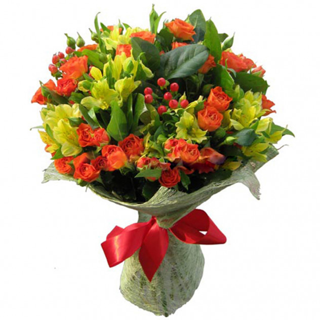 Упаковка для букета: сезаль, Роза кустовая 9шт., Альстромерия 7шт., Гиперикум 3шт., Салал 5шт.