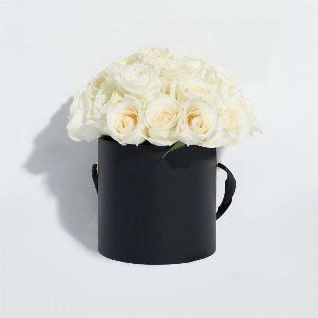 Стильный букет из белых роз в шляпкой коробке премиум.