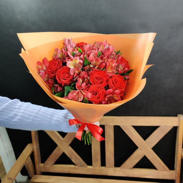 Потрясающий яркий букет из альстромерии и роз, непременно подарит радостное настроение своему обладателю! Роза - 9 шт. Альстромерия - 10 шт. Лента - 1 шт. Пленка - 2 шт.