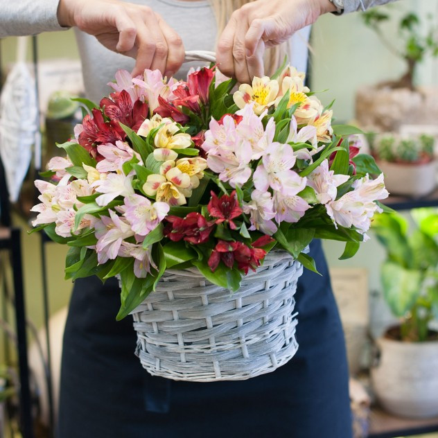 Корзина из 15 разноцветных альстромерий с декоративной зеленью.