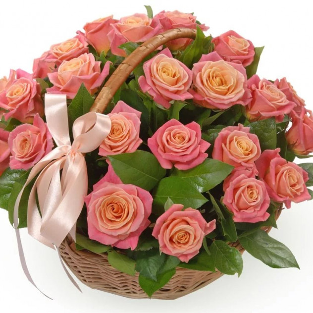 Упаковка (пленка с лентой), Доставка, Роза кремовая 60 см 25шт., Пиафлор (оазис) 3шт., Корзина плетенная