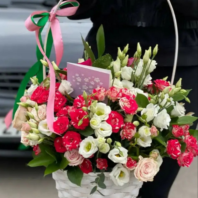 Состав: Эустома (Лизиантус, Японская роза) - 8 шт. Писташ - 1 шт. Роза кустовая - 19 шт. Корзина - 1 шт.